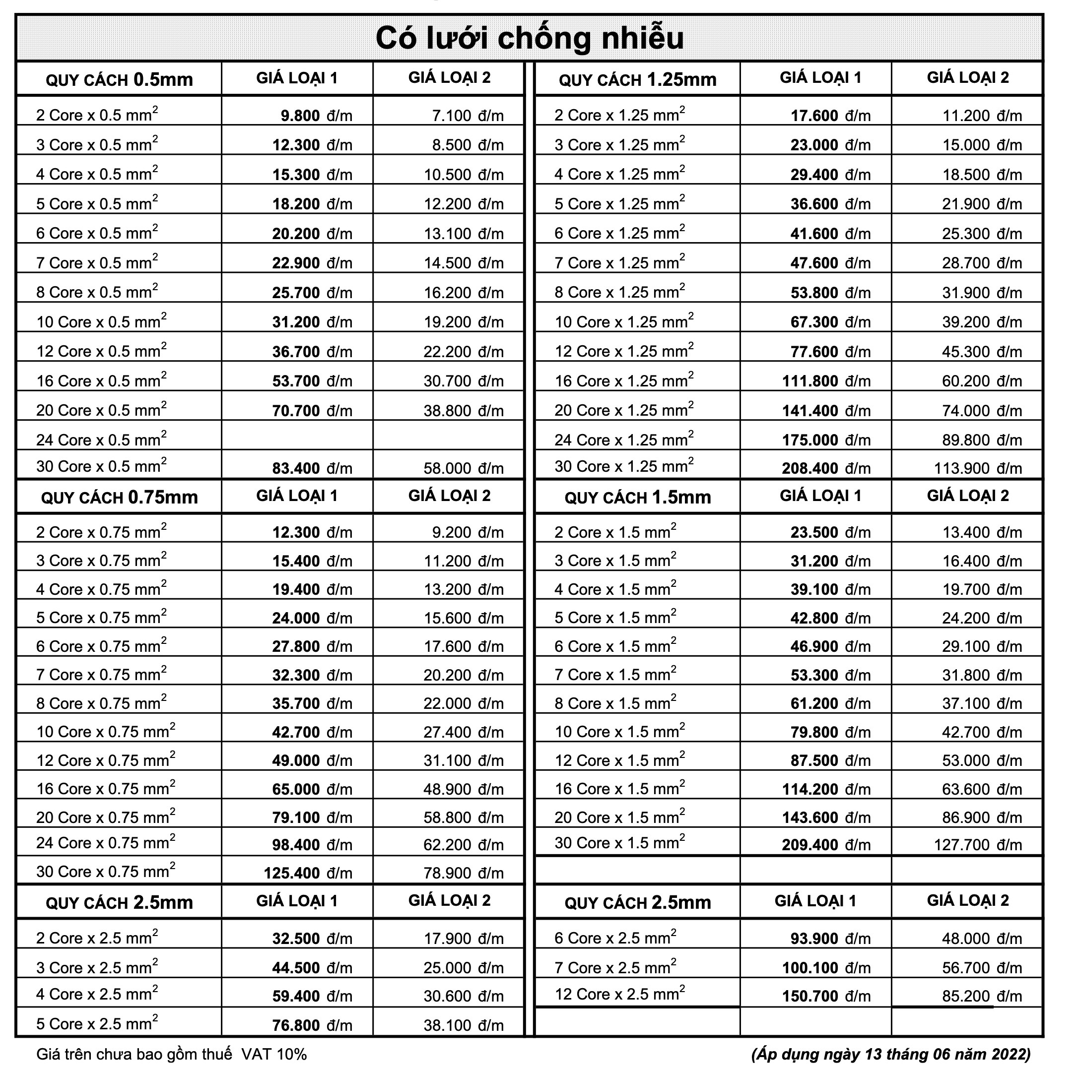 Bảng giá các loại cáp điều khiển Sangjin – loại có lưới được liệt kê trong bảng dưới
